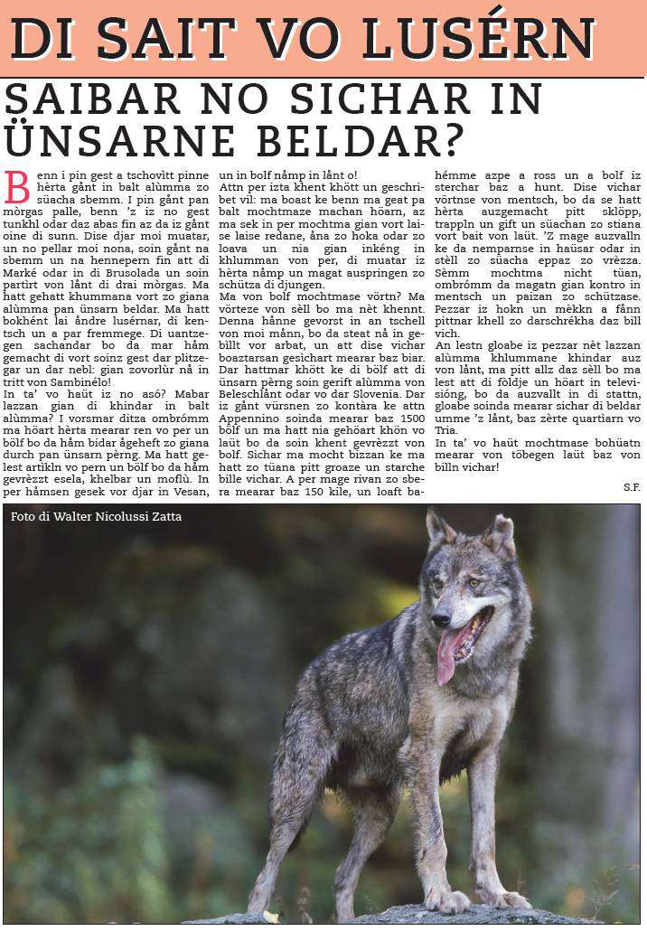 Benn i pin gest a tschovìtt pinne hèrta gånt in balt alùmma zo süacha sbemm. I pin gånt pan mòrgas palle, benn ’z iz no gest tunkhl odar daz abas fin az da iz gånt oine di sunn. Dise djar moi muatar, un no pellar moi nona, soin gånt na sbemm un na hennepern fin att di Marké odar in di Brusolada un soin partìrt von lånt di drai mòrgas. Ma hatt gehatt khummana vort zo giana alùmma pan ünsarn beldar. Ma hatt bokhént lai åndre lusérnar, di kentsch un a par fremmege. Di uantzegen sachandar bo da mar håm gemacht di vort soinz gest dar plitzegar un dar nebl: gian zovorlùr nå in tritt von Sambinélo! In ta’ vo haüt iz no asó? Mabar lazzan gian di khindar in balt alùmma? I vorsmar ditza ombrómm ma höart hèrta mearar ren vo per un bölf bo da håm bidar ågeheft zo giana durch pan ünsarn pèrng. Ma hatt gelest artìkln vo pern un bölf bo da håm gevrèzzt esela, khelbar un moflù. In per håmsen gesek vor djar in Vesan, un in bolf nåmp in lånt o! Attn per izta khent khött un geschribet vil: ma boast ke benn ma geat pa balt mochtmaze machan höarn, az ma sek in per mochtma gian vort laise laise redane, åna zo hoka odar zo loava un nia gian inkéng in khlumman von per, di muatar iz hèrta nåmp un magat auspringen zo schütza di djungen. Ma von bolf mochtmase vörtn? Ma vörteze von sèll bo ma nèt khennt. Denna hånne gevorst in an tschell von moi månn, bo da steat nå in gebìllt vor arbat, un att dise vichar boaztarsan gesìchart mearar baz biar. Dar hattmar khött ke di bölf att di ünsarn pèrng soin gerift alùmma von Beleschlånt odar vo dar Slovenia. Dar iz gånt vürsnen zo kontàra ke attn Appennino soinda mearar baz 1500 bölf un ma hatt nia gehöart khön vo laüt bo da soin khent gevrèzzt von bolf. Sichar ma mocht bizzan ke ma hatt zo tüana pitt groaze un starche bille vichar. A per mage rivan zo sbera mearar baz 150 kile, un loaft bahémme azpe a ross un a bolf iz sterchar baz a hunt. Dise vichar vörtnse von mentsch, bo da se hatt hèrta auzgemacht pitt sklöpp, trappln un gift un süachan zo stiana vort bait von laüt. ’Z mage auzvalln ke da nemparnse in haüsar odar in stèll zo süacha eppaz zo vrèzza. Sèmm mochtma nicht tüan, ombrómm da magatn gian kontro in mentsch un paizan zo schützase. Pezzar iz hokn un mèkkn a fånn pittnar khell zo darschrékha daz bill vich. An lestn gloabe iz pezzar nèt lazzan alùmma khlummane khindar auz von lånt, ma pitt allz daz sèll bo ma lest att di fòldje un höart in televisióng, bo da auzvallt in di stattn, gloabe soinda mearar sichar di beldar umme ’z lånt, baz zèrte quartìarn vo Tria. In ta’ vo haüt mochtmase bohüatn mearar von töbegen laüt baz von billn vichar!