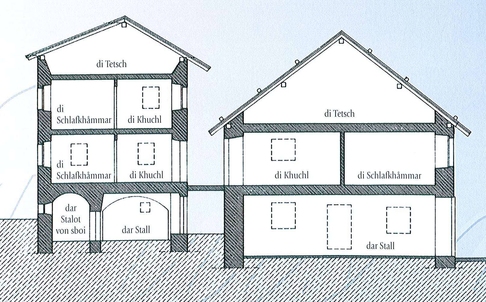 Le prime costruzioni furono realizzate secondo il sistema blockbau, vale a dire con travi sovrapposte ed incrociate, la copertura era in scandole (assicelle di larice) fermate da grosse pietre.