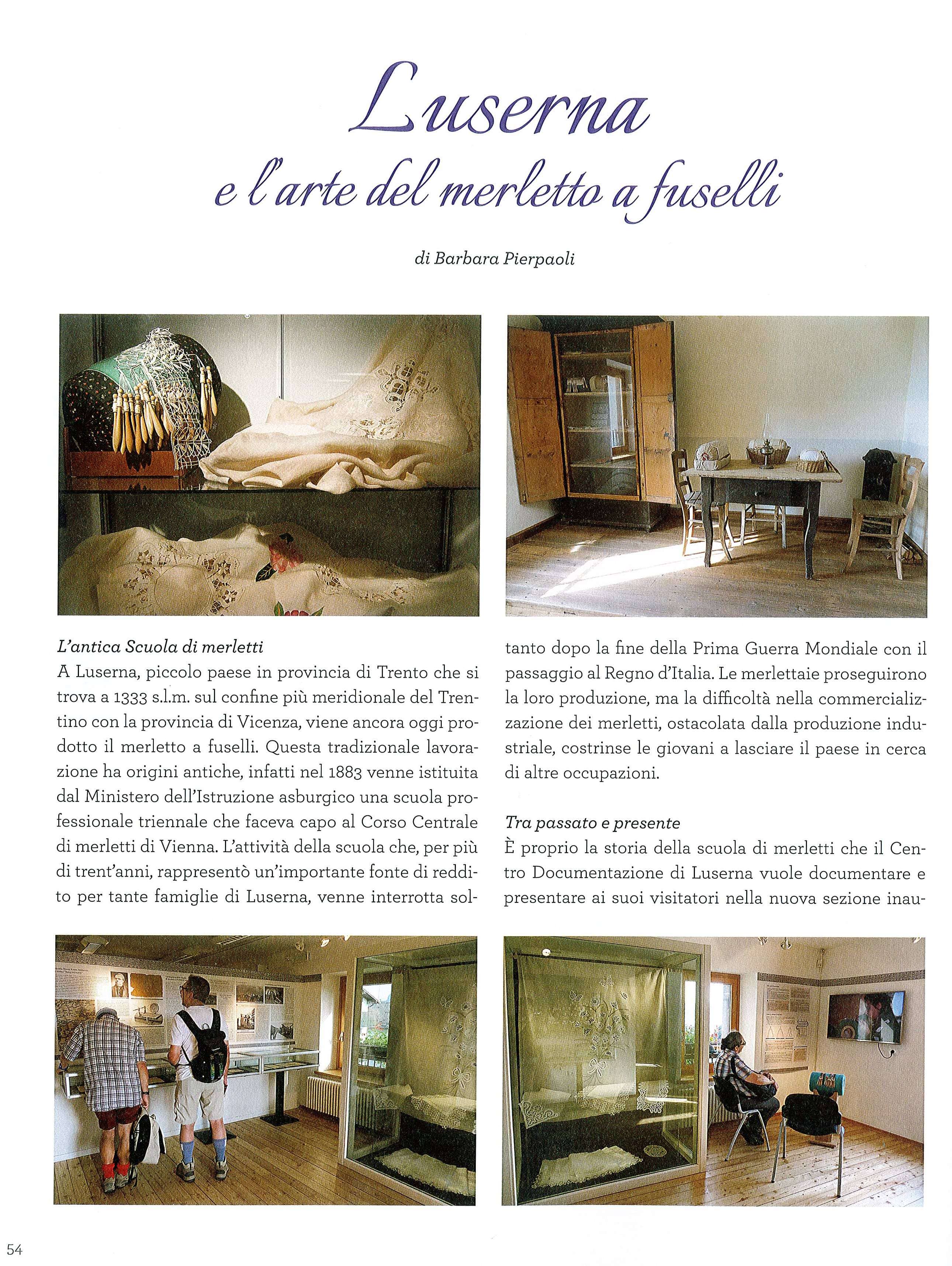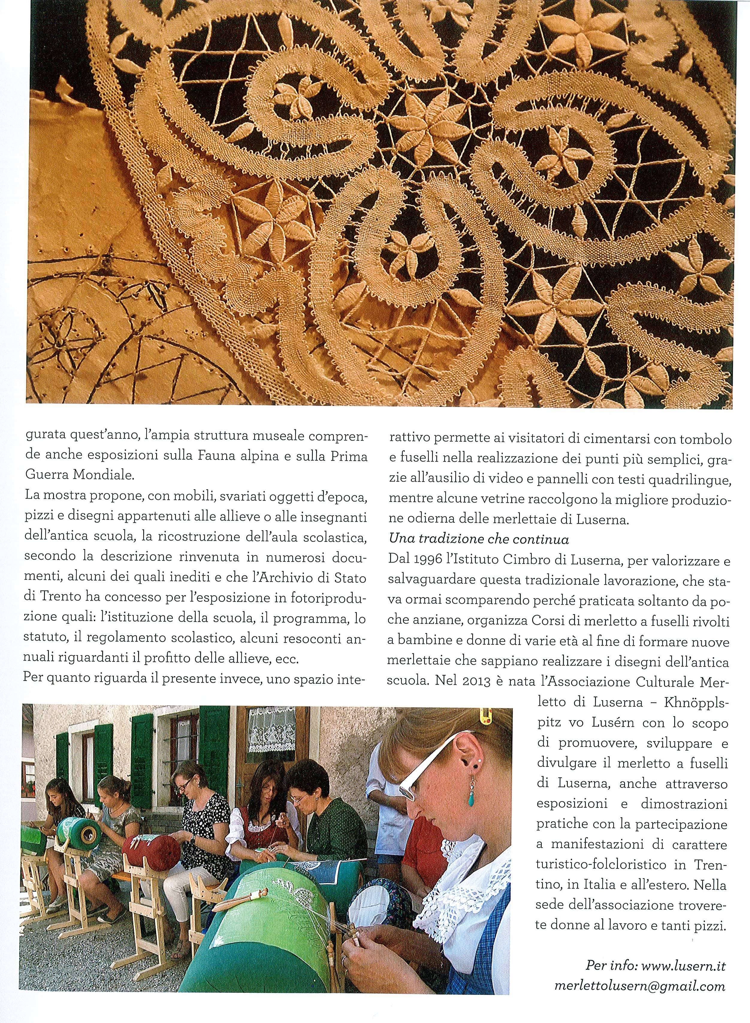La lavorazione è tipica di Luserna-Lusérn infatti, nel 1883, il Ministero dell’Istruzione di Vienna istituì la Scuola professionale di durata triennale per formare ad un mestiere tante ragazze. Il Corso Centrale di merletti di Vienna si occupava della specializzazione delle insegnanti, della fornitura di disegni e del materiale didattico e della commercializzazione dei merletti.